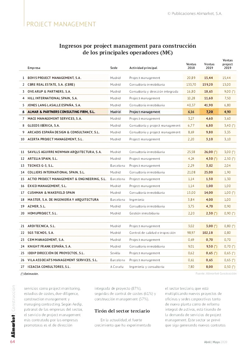 Once again, we can proudly show you that, thanks to the effort, work, and quality of our professionals, Almar Consulting is among the 10 best-positioned technical companies for the work performed, occupying 6th place, making it the best nationally owned company in the ranking.